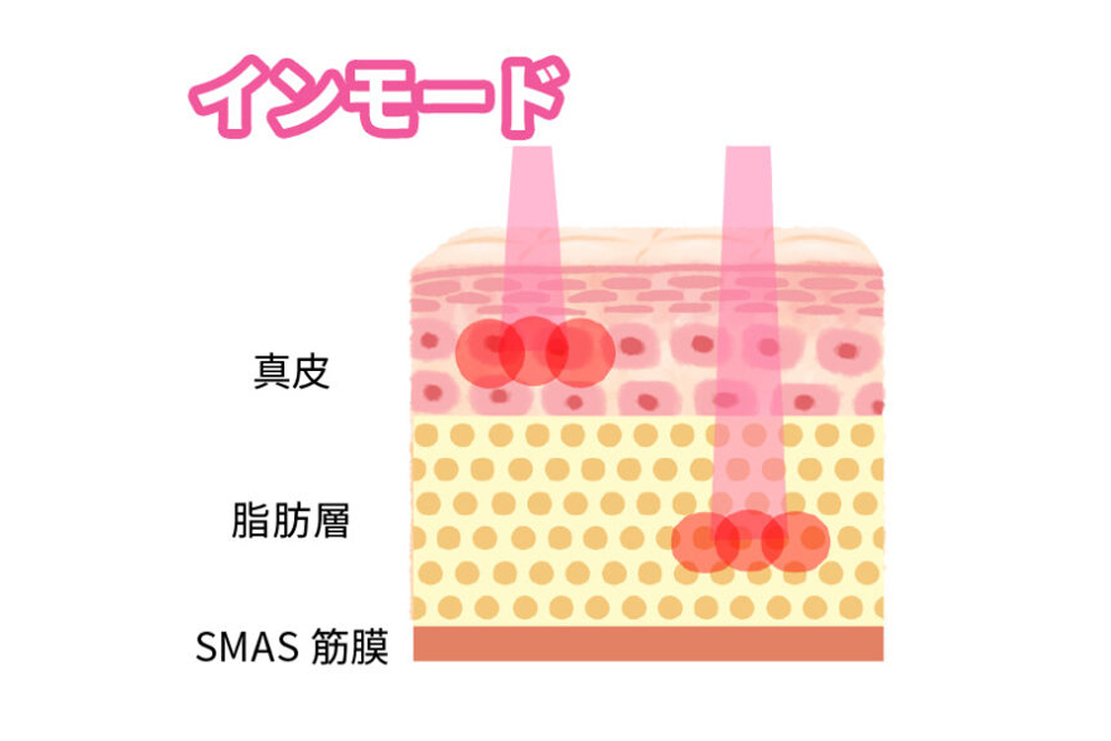 HIFUに比べ、インモードはラジオ波(RF)でじんわり温める仕組みのため、痛みが穏やかです。また、HIFUが点で皮膚の内部に集中的に熱を与えるのに対し、インモード(ミニFX・フォーマ)は面で熱を与えるため、一瞬の刺激が小さいことも痛みが軽減できる理由のひとつです。